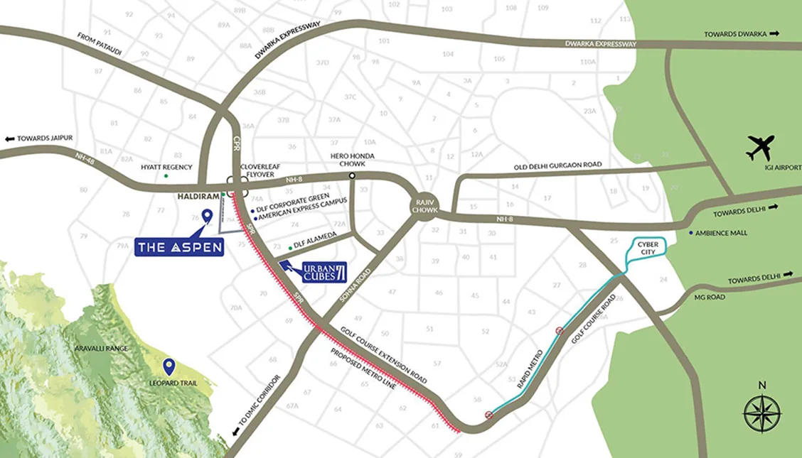 Developing over **13 acres of prime land**, Whiteland Aspen Iconic features towers with **G+42 levels**, designed by the legendary architect **Hafeez Contractor**. With its strategic location, residents enjoy seamless connectivity to the Delhi-Jaipur Expressway (NH-48), Dwarka Expressway, and Southern Peripheral Road, making it a worthwhile address for luxury living. Read More..